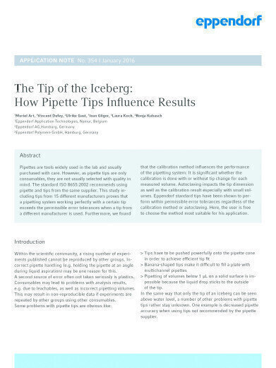 The results of a large scale study in which a broad array of factors was identified which may negatively influence pipetting results can be found in Application Note 354, ‘The Tip of the Iceberg – how tips influence results’ at www.eppendorf.com/eptips.