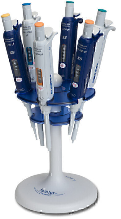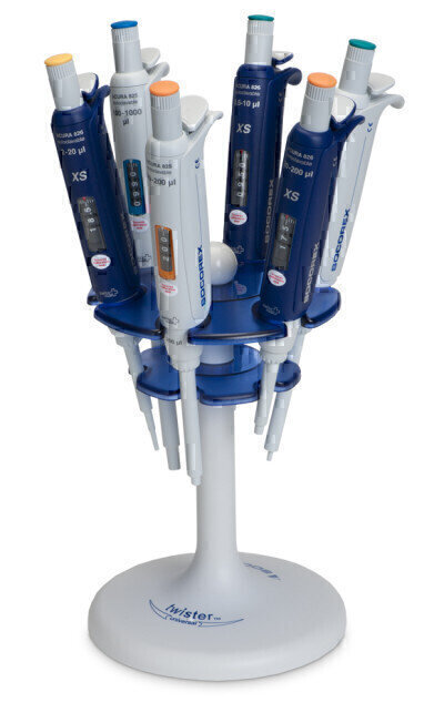 TwisterTM universal 336, pipette workstation provides storage space for six pipettes of most brands. Its 360° rotation enables quick instrument selection, each being easy to fetch. Few parts only - simple to disassemble and reassemble for cleaning.