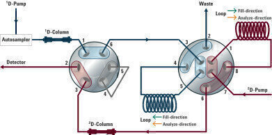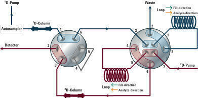 Figure 2: Setup for comprehensive 2D-LC analysis; (A/B) Modulation using the 2-position/4-port-duo valve. -