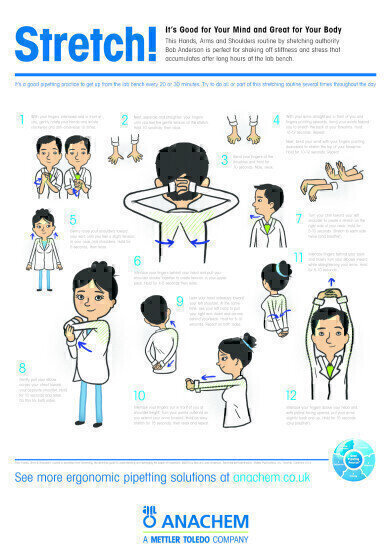 There are a wide range of white papers, posters and videos available on the Anachem web site to help educate you and your colleagues reduce your risk of developing a painful RSI such as 'Gamers Thumb'. The numbers of scientists reporting pain in their thumbs is on the increase, which is not a surprise when you think how much your thumb gets used during the course of a day e.g. pipetting for an hour, texting and generally using your phone during tea and lunch breaks, pipetting again after breaks then again using your phone after work. Your poor thumb never gets a rest. So we have developed the extremely popular Stretch Poster which shows diagrams with instructions of the different ways you can stretch to ensure that you shake off the stiffness and stress that accumulates after long hours at the lab bench.