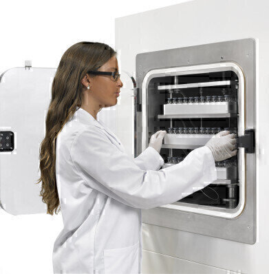 The Lyobeta is available in four models, with 0.45, 0.6, 0.75 and 0.9 m2 of useful shelf surface area that can be temperature regulated in the range -55ºC to +80ºC. A cascade refrigeration system utilising ecological refrigerants cools the shelves and feeds a -85ºC condenser.