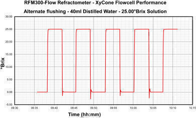 Latest Xylem brand Bellingham + Stanley RFM-Flow refractometers fitted with XyCone cells cleverly use vortex technology to sweep away the previous sample without leaving entrapped air so that only minimal flushing is required to achieve results as accurate as ±0.01 °Brix. There are two types of RFM-Flow refractometer, the RFM300-Flow with Peltier temperature control and RFM700-Flow Series that uses temperature compensation; the latter being one of the most viable factory or field instruments on the market.