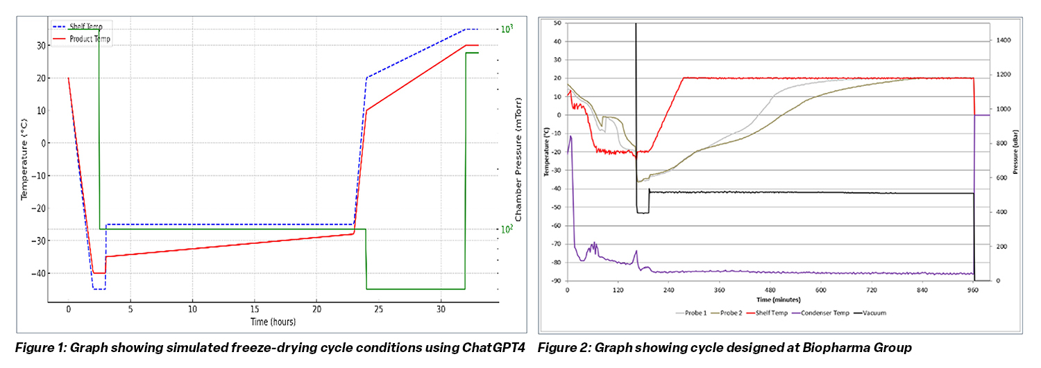 To assess AI’s practical utility, Biopharma Group compared a ChatGPT-generated freeze-drying cycle with one designed by its R&D team for a 10% Dextran 40K solution.