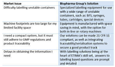 As a market leader within the small to medium range biotech and liquid fill/finish sectors, it is with pleasure that Biopharma Group announces a strategic partnership with ETIMA Pharma to distribute linear labelling solutions for the aseptic processing lines in pharma industries along with rotary can and bottle labelling systems across the UK, Ireland, and France.
