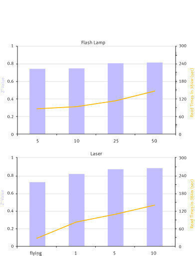 The trend towards assay miniaturisation for high-throughput requires the ability to measure the smallest possible quantity. The outstanding sensitivity of the PHERAstar FSX is based on an innovative optical design which includes a free air optical path, three independent light sources, dedicated Photomultiplier Tube detectors (PMT), Simultaneous Dual Emission detection and high transmission filters. To ensure the best performance for any HTS assay the PHERAstar FSX comes with a high energy xenon flash lamp, a dedicated laser for Alpha Technology and a next generation laser for TRF/TR-FRET. The new TRF laser with its frequency of 60 flashes per second increases throughput and measurement precision and allows for a full 1536-well plate to be measured in only 36 seconds (Figure 2).
