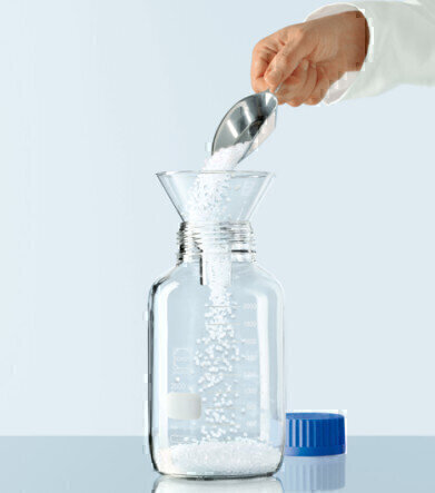 Particularly easy to use are the DURAN GLS 80 wide neck bottles: Their large 80 mm neck makes them easy to fill and empty without the risk of spillage when handling powders or substances in paste or granule form. Working with scoops, spatulas and tweezers is no problem thanks to the wide mouth. Even large-volume funnels can be inserted into the bottle easily and securely and cleaning is simple and convenient. The specially developed thread and corresponding quick release closure allow the bottle to be opened and closed in less than a turn.