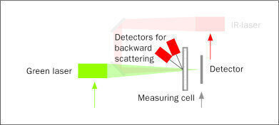 The very large measuring range from 0.01 µm to 2100 µm of the ANALYSETTE 22 NanoTec results from the combination of two lasers with two different measuring cell detector spacings: Large particles are detected using an infrared laser with a large distance to the measuring cell, for small particles a green laser with a small distance to the cell is used, which permits the detection of the forward scattered light up to a scattering angle of 65°. The measurement of smallest particles down into the nano range is performed by the green laser light for backward scattering. Specially arranged detectors ensure this. Especially convenient: The total measuring range of 0.01 – 2100 µm in the ANALYSETTE 22 NanoTec can be detected without converting the optical elements.