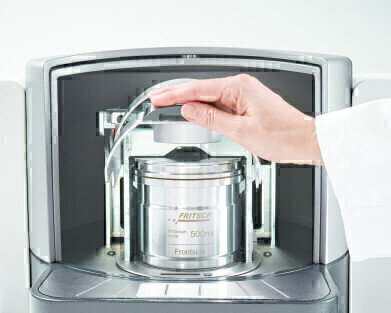 The grinding bowl is simply inserted in the PULVERISETTE 5 premium line from the front into the holder. Correct positioning is automatically ensured by a practical guide. The PULVERISETTE 5 premium line does not start until both bowls are correctly inserted and prevents due to bowl detection via RFID chip, the setting of too high speeds depending on the bowl material used.