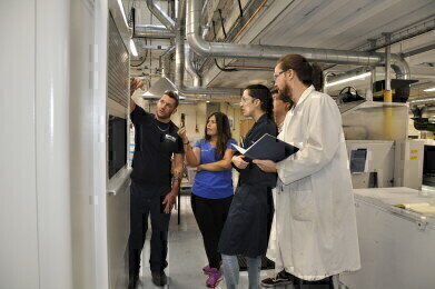 Training in place: P.E.I’s Dard Judicael instructs PhD students Eva Pappa, Helena Pérez Martin and Dr Colin Robert in the art of recipe building on the platen press. -