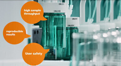 On the OMNIS Sample Robot, the entire analysis is performed in a closed system, so there is no risk of physical contact with solvents or reagents at any time. For reliable and reproducible results, the sensor of the system is rinsed and conditioned after each determination. For increased safety and convenience, the system can be operated in any standard size fume hood.
