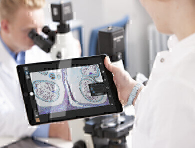It adds sophisticated digital features to any microscope and is particularly effective at saving time and enabling interactive scenarios, using wired or wireless network connectivity.