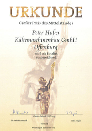 The awards gala for the competing regions of Bavaria, Baden-Württemberg, Hesse, and Thuringia took place on 26 September in Würzburg. More than 400 entrepreneurs and numerous invited guests participated, including Offenburg-based Peter Huber Kältemaschinenbau GmbH. The manufacturer of high precision thermoregulation was honoured as one of the five ‘finalists’ from Baden-Württemberg, prevailing against strong competitors. 5,009 small and medium enterprises were nominated for the 2015 competition Germany-wide – this is a new record in the competition's 21-year history. Huber was nominated by the City of Offenburg and Volksbank Offenburg eG.