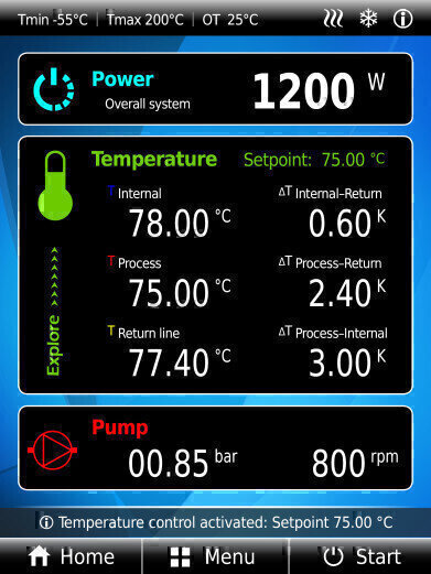 The new E-grade 'Explore' for Unistats is more than just another function package. E-grade 'Explore' visualises useful information about temperature, heating/cooling capacity and pump capacity in the system directly on the touch panel. E-grade 'Explore' is a further development of the Unistat technology and utilises the outstanding features of Unistats to display important process and performance data directly on the device display. Relevant measurements can also be processed via the digital interfaces. E-grade 'Explore' turns a Unistat temperature control unit into a process technology and process engineering development tool. In addition to targeted process optimisation and process development, the E-grade allows the estimation of heat balances and termination criteria and the implementation of use tests and the collection of data for extended process scale-up experiments.