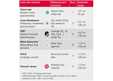 The different packaging has to be tested in their early stages of development to a very low leak specification. Moreover, during production a visual inspection and an additional leak test is required up to 100 %, depending on the packaging type. The Limit of Detection (LOD) for production units is defined as a risk-based decision between cost, technology and product. Additionally, laboratory tests and in process controls (IPC) are performed on a tighter sensitivity level.