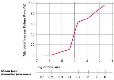 While in the early development stage of packaging, the supplier is obliged to ensure that the packaging is by design capable of ensuring sterility. Therefore, the packaging must to be tested for defects in the range of 0.2 µm, respectively 6 * 10-6 mbar*l/s ("maximum allowable leak level"; MALL). Based on a study from Kirsh, this is the defect size where the microbial ingress failure rate is 0 %. Integrity tests are mainly performed in the range of 2 to 20 µm defect size. The main reason for this is the feasibility of the available methods to detect smaller defects in a reasonable test time. When dealing with 100 % inspection of the production line that operates at speeds for 120 to 600 parts per minute, the allowed defect size is sometimes even increased to a significantly higher level. To compensate on the risk-based approach, additional off-line sample testing is performed to a tighter specification in the range of 1 to 10 µm. This also applies to stability testing which is performed in laboratory tests. Here again the sensitivity is more important than the test time.