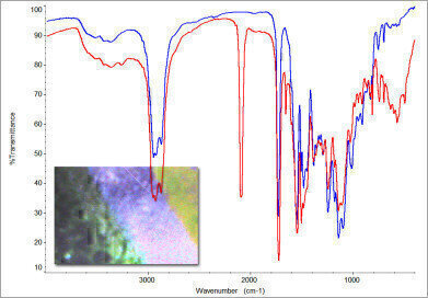 This application required various colors on a printed aluminum panel to be analysed. Due to the close proximity of the colors on the sample, the GladiATR Vision as a sampling accessory was advantageous over traditional specular reflection accessories because it allowed the desired sample area to be pinpointed and documented using a camera focused onto the sample. Figure 2 shows the spectra of green printed ink and an unprinted area. From the difference between these two spectra, the unique features of the green printed ink may be observed in the CN stretch region, specifically the strong absorbance band located at 2100 cm-1. The inset shows a typical image that was viewed as the sampling position was located.