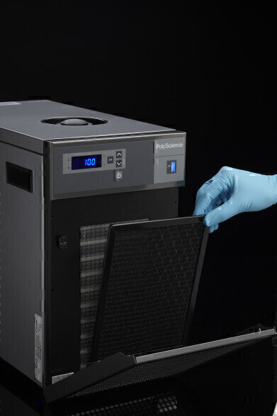 Three different models of PolyScience compact chillers are available: The LS Series, which has a working temperature range of -20° to +40°C and provides 475 watts of cooling at -10°C; the LM-Series, with a working temperature range of -10° to +30°C and a 230 watt cooling capacity at -10°C; and the MM-Series, which has a working temperature range of -5° to +50°C and provides 129 watts of cooling at -5°C. All three models control temperature with ±0.1°C stability and are equipped with a low flow rate alarm, user-adjustable high and low temperature alarms, a top-mounted fill port with built-in fluid filter, lighted fluid level indicator, and washable rigid-frame air filter.