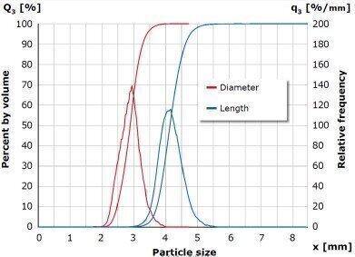 Transparent plastic granulate Thanks to a new brighter light source and cameras with higher resolution in the CAMSIZER P4, transparent particles can be captured with excellent contrast, permitting accurate and precise detection. The example shows the length and the diameter analysis of transparent plastic granules.