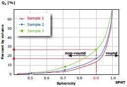 The graphic shows the measure of the sphericity of glass beads. At least 80% of the beads need to be spherical to fulfil the high quality standards for retro-reflectivity.