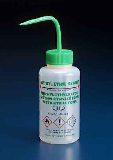 The new multi-lingual, non-vented, Methyl-ethyl-ketone wash bottle is printed with the chemical name, CAS number, NFPA diamond, GHS symbols and safety information in the following four languages, English, French, German and Spanish.