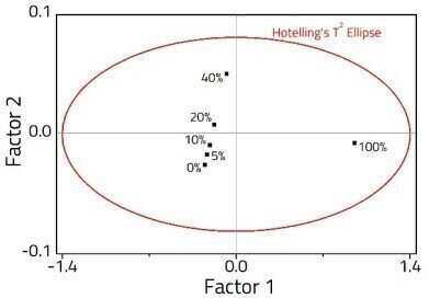 Figure 2: PLS Scores plot showing the sample distribution in 2 -factor space.