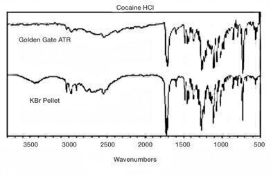The reading of Cocaine HCl compares a Golden Gate ATR reading to a transmission reading of a KBr pellet of Cocaine HCl.