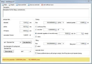 Ready-made syringes (made of polypropylene - PP) with 5ml, 20ml and 50 (PP) ml can be used, but the holder of each syringe also allows the use of custom-made syringes with an outer diameter of 9 to 34 mm. For each syringe, the flow rates can be varied over a range of 6 orders of magnitude using the software supplied (alternatively directly with the Lab View software). Depending on the syringe volume, flow rates from 0.03 nL/s up to 760 µL/s can be easily set. Several double syringe modules (up to 6 in a combi bank) can be controlled individually via the control software. A screenshot of the set-up menu is shown in Figure 2.