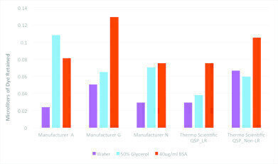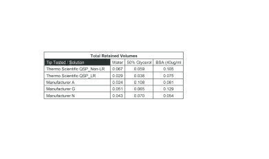 In this study, liquid retention levels of different types of solutions were determined on various pipette tips from major manufacturers. The data demonstrated that Thermo Scientific™ QSP low retention tips retain less volume compared to QSP non-low retention tips and other manufacturers of low retention pipette tips. The QSP low retention properties improve pipetting accuracy and precision.