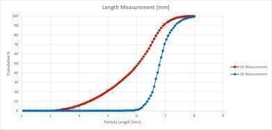 Analysis results of cylindrical extrudates 2D vs. 3D. Length distribution shows that the 2D result is ‘too short’: particle images don’t show the correct length due to random orientation. -