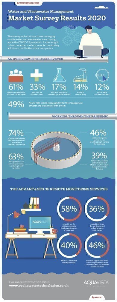 In a recent market survey, Veolia Water Technologies (VWT) looked at how those managing on-site water and wastewater were coping, since the COVID-19 pandemic and how water treatment had been affected during the lockdown period. Over 100 people were surveyed and the results indicated that nearly 63% of those surveyed were not using any remote monitoring services within their operations - highlighting a clear potential to better protect sites in the future.