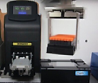 Ziath Mirage camera-based 2D barcode tube reader in action on STRIP-1 Robot system.