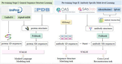 S2ALM’s two-stage framework: Stage I learns sequence–structure patterns from protein data, while Stage II applies antibody-specific training with Sequence–Structure Matching and Cross-Level Reconstruction. Credit: Copyright © 2025 Mingze Yin et al