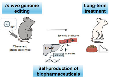 System for In Vivo Genome Editing–Mediated Exenatide Production and Its Therapeutic Application in Obese Mice. Credit: Keiichiro Suzuki