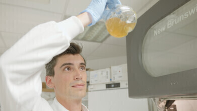 A PhD student checks the growth of a culture of E. coli in the Wallace Lab.. Credit: University of Edinburgh