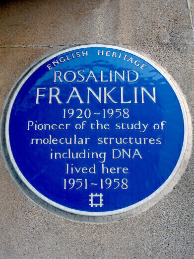 An English Heritage plaque on Franklin's London home, recognising her role in the study of DNA. Credit: Wikimedia Commons. -