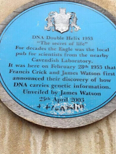 A local history society plaque on The Eagle Pub, in Cambridge, often frequented by Watson and Crick as students, with graffiti added to highlight its failure to acknowledge Franklin's contribution to the discovery of DNA. Credit: Wikimedia Commons. -