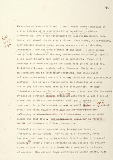 In particular, Purdy who was a former nurse, emerged as a vivid character through depictions of her long car journeys alongside Edwards from Cambridge to Oldham where Steptoe’s clinic was based. Abse added details of these journeys such as stops at a transport café where Edward’s would choose Bob Dylan to play on the jukebox – Purdy’s corrections to the manuscript replaced ‘listen’ with ‘be subjected to’, showing she was no Dylan fan. She became ‘one of the central cast’ through extended descriptions and dialogue with Abse inserting praise for Purdy’s determination, loyalty and support for the patients.