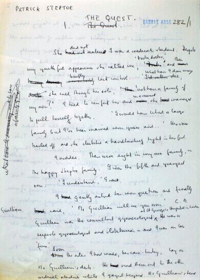 A draft by Dannie Abse of the definitive first chapter, “The Quest”, which begins with a scene of Patrick Steptoe as a medical student encountering a woman suffering from infertility. Dannie Abse Papers, folder 282/1, 1. The National Library of Wales Collection. -