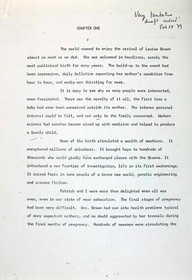 Abse’s influence pervades the book. He doubled the number of chapters, restructured scenes and introduced dialogue that dramatised the struggles of women experiencing infertility. He drew on references from Aldous Huxley and the Bible, and inserted literary devices to foreshadow IVF, including allusions to Sarah, Abraham’s wife, who bore a child in old age. Edwards sometimes objected to these embellishments, writing “Not true” and “This isn’t me!” in the margins but the publishers usually overruled him.