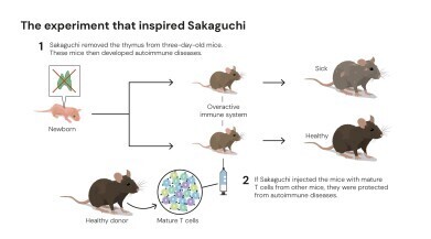 Since the 1970s, the existence of ‘suppressor T cells’ had been proposed which were capable of moderating immune activity. However, inconsistent experimental evidence caused the hypothesis to fall out of favour. But one scientist persisted: Dr Shimon Sakaguchi, working at the Aichi Cancer Center Research Institute in Nagoya, Japan, was intrigued by experiments in which newborn mice, deprived of their thymus, developed severe autoimmune conditions rather than weakened immunity. This paradox suggested that the thymus must produce not only aggressive defender cells but also a second population that restrained them.