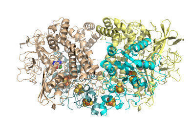 Hyd1 overall cartoon with cofactors Hydrogenase is made of four chains of protein folded up and holding atoms of nickel and iron buried inside to form a site where hydrogen gas can be split