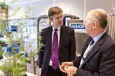 Minister for Universities, Sciences and Cities, Greg Clark, chats to Alex Jukes who is working on extracting valuable chemicals from tomato plant leaves (Photo credit: Ian Martindale) -