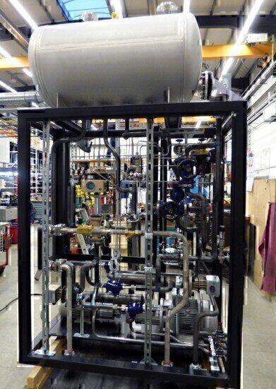 The heat transfer system was adapted to the special requirements of the customer. The image shows the open system. All lines are thermally isolated prior to delivery. -