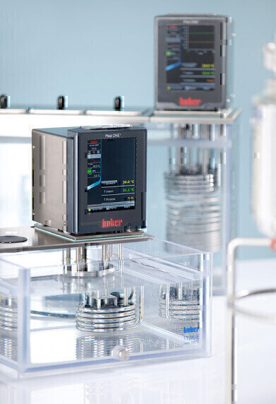 Huber Ministats are the smallest cooling thermostats in the world. Despite their size they have enough power to thermoregulate photometers, refractometers, viscosimeters, distillation apparatus, reactor vessels and mini plants. Their compact form allows them to be placed in areas where space is at a premium, for example laboratory extraction hoods. Ministats are available in three models with a temperature range from -45°C to +200°C and cooling capacities of 600 watts. They can be used to control externally closed applications or alternatively objects can be thermoregulated directly within the bath.