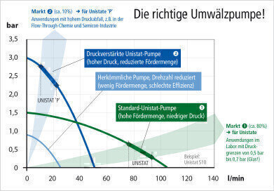 Circulation pumps are ideally designed so that a turbulent flow generates a large heat transfer coefficients (alpha value) and thus efficient heat transfer to/from the internal heat exchangers (evaporator and heating). In practice, in 90% of all applications glass is used (reactors, distillation apparatus, etc.) and the permissible system pressure in these applications is maximum 0.5 bar. This is why Unistat pumps offer large circulation volumes instead of high pressure, they need significantly less (pumping) motor output to accomplish high flowrates.